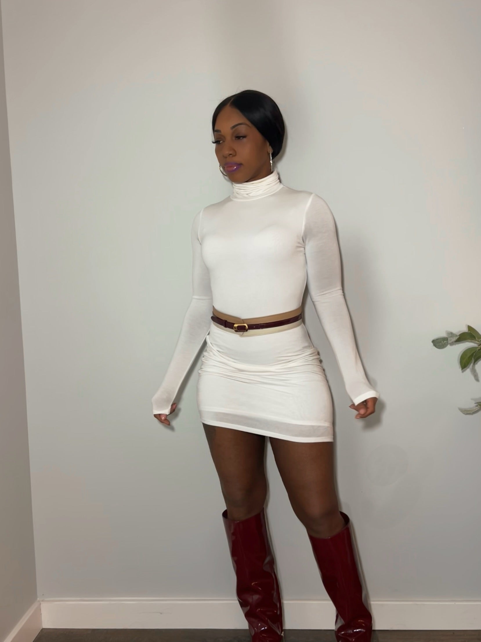 -Long sleeve turtleneck mini dress