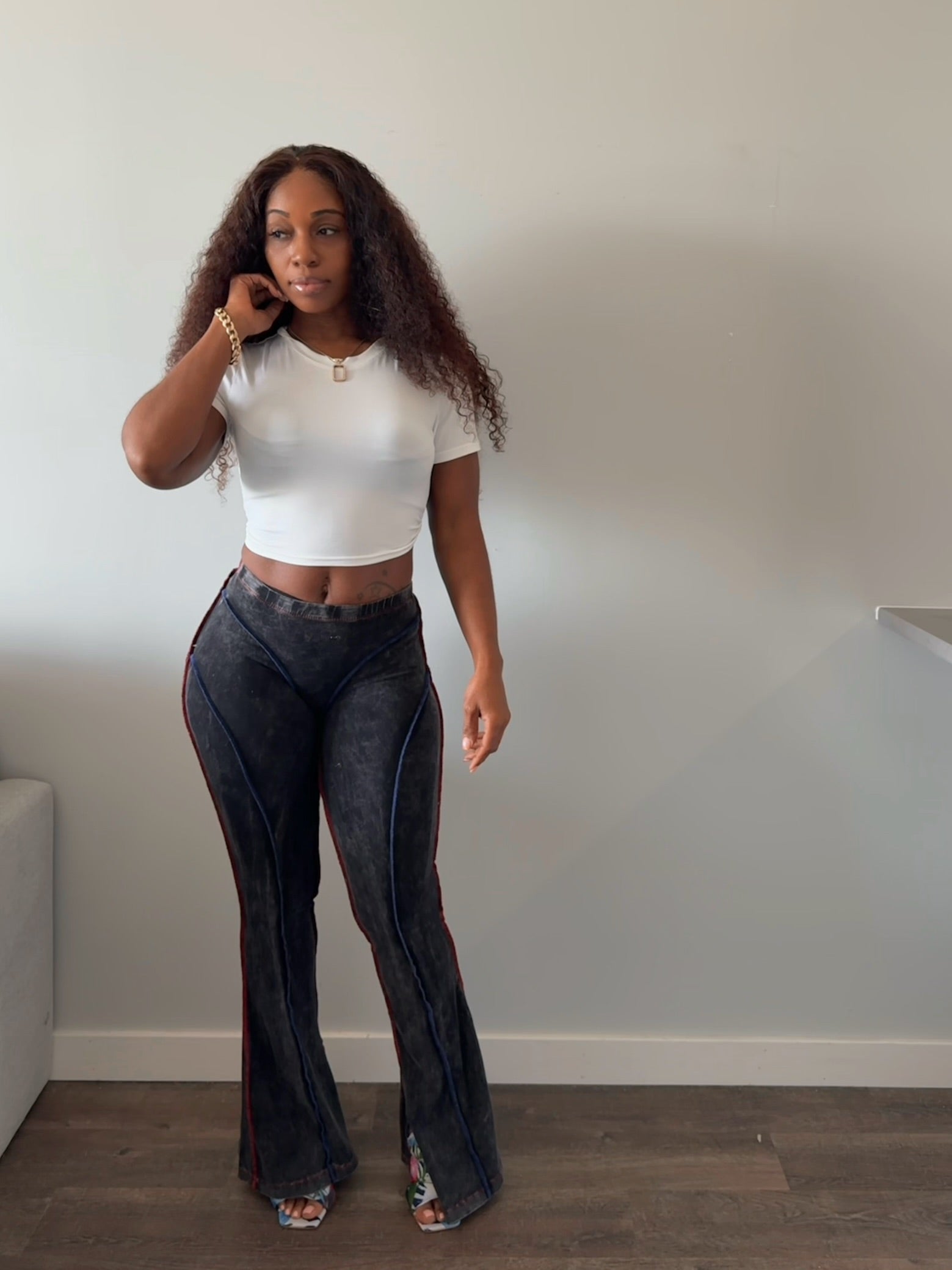 Firework denim boot flared pants with red and blue striped detail . The stretch is generous and body shaping.